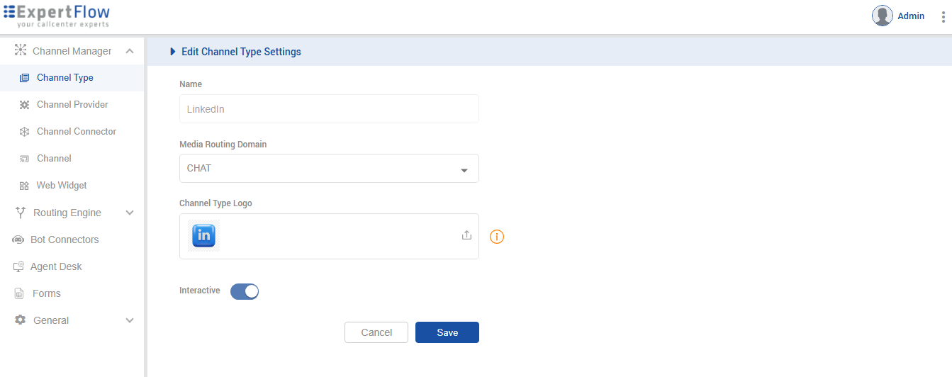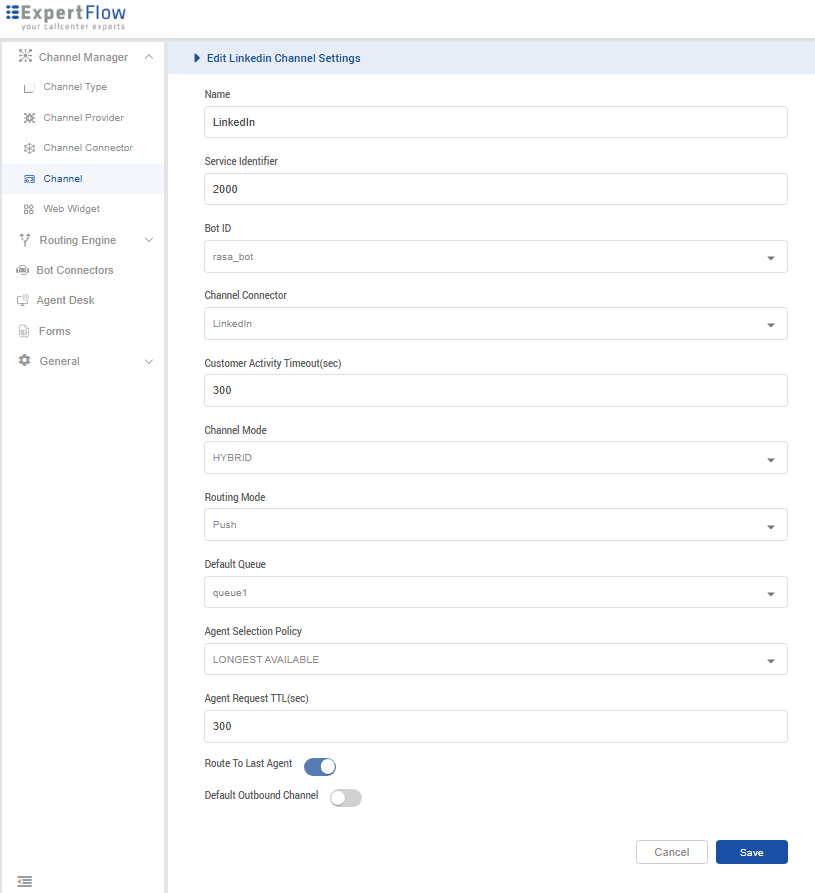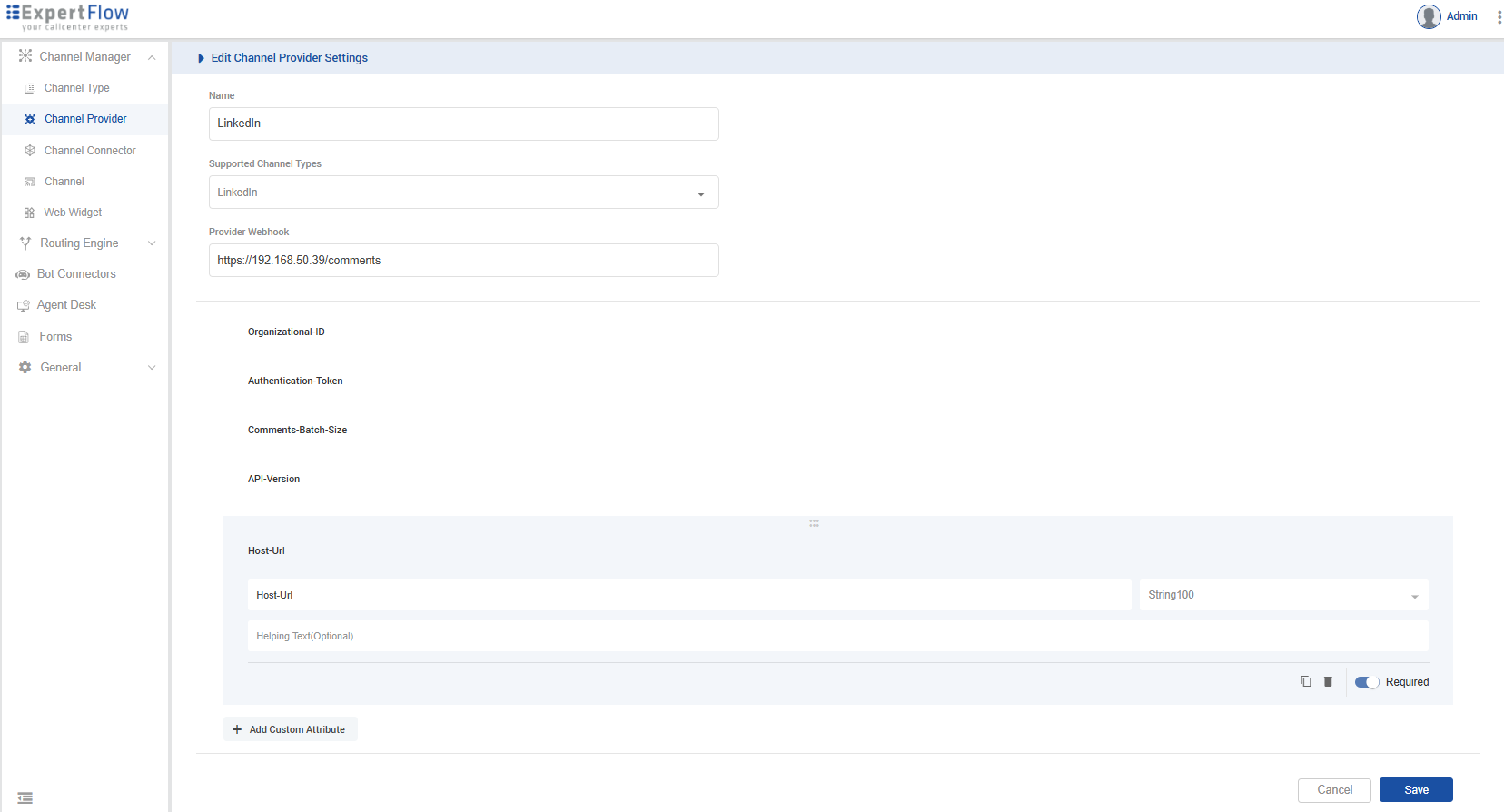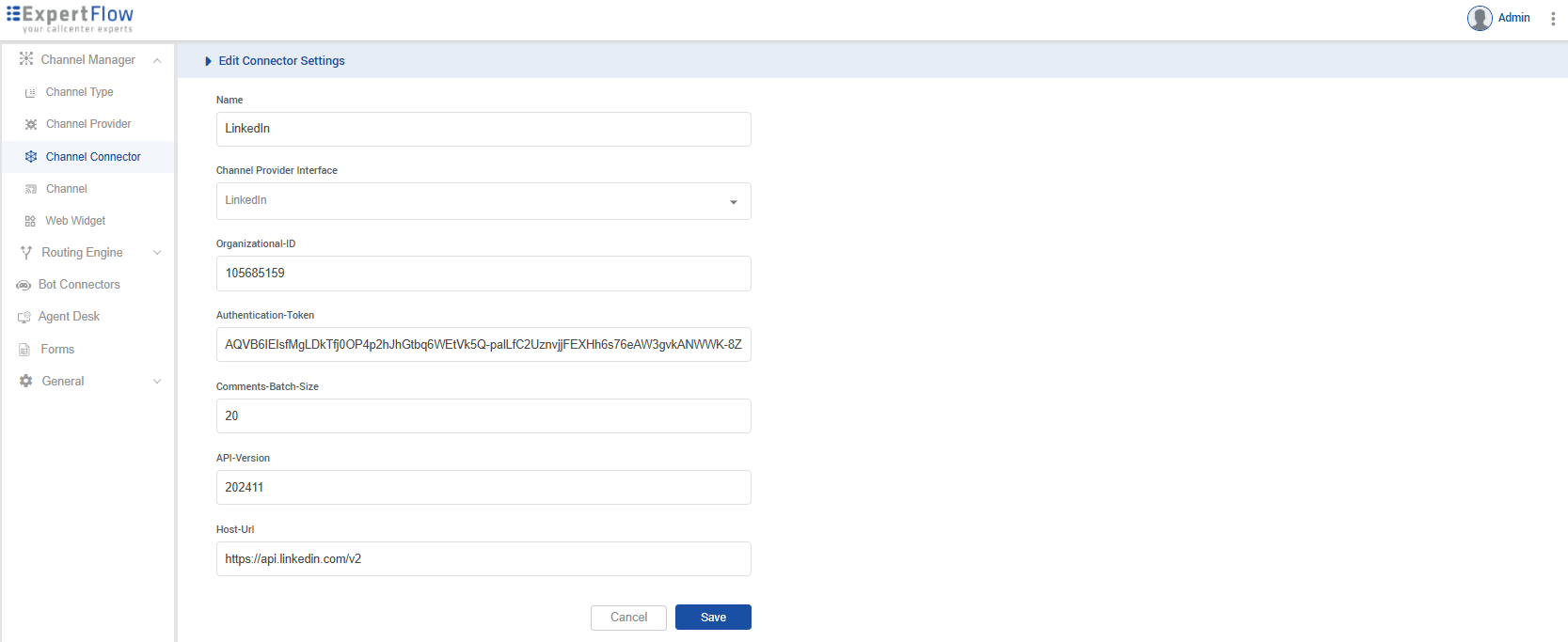To set up the LinkedIn Channel, the LinkedIn connector needs to be configured in the Unified Admin of the Expertflow CX's application.
