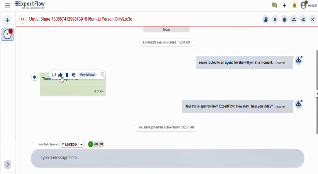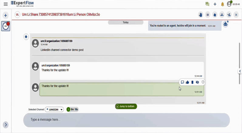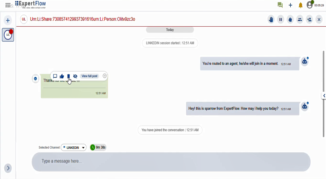 Expertflow CX provides integration of the LinkedIn Channel via: