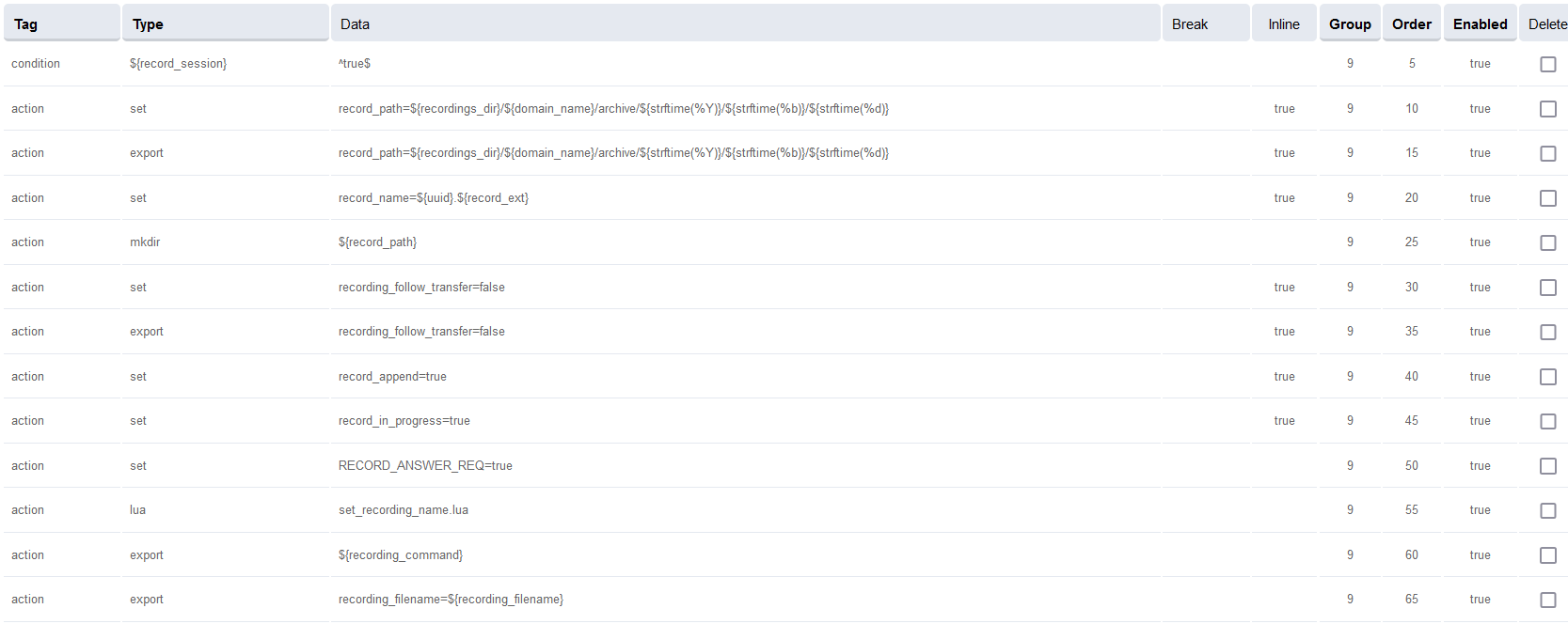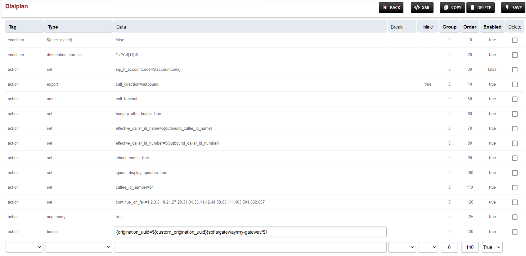 To the last row, where the Type field is bridge, append {origination_uuid=${custom_origination_uuid}} to the start of the field in the Data column. The result will look as below: