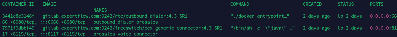 On the Voice connector and Dialer servers, use the command docker ps to list the containers.