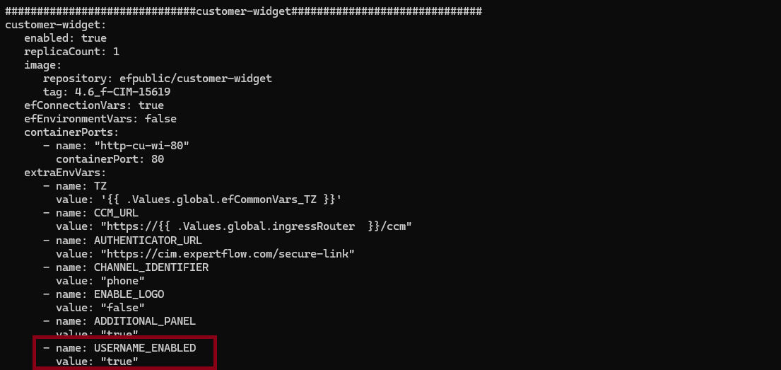 USERNAME_ENABLED: A boolean configuration variable was added in thehelm-values/ef-cx-custom-values.yamlfile and is used to control the display of the agent's name in the customer widget.