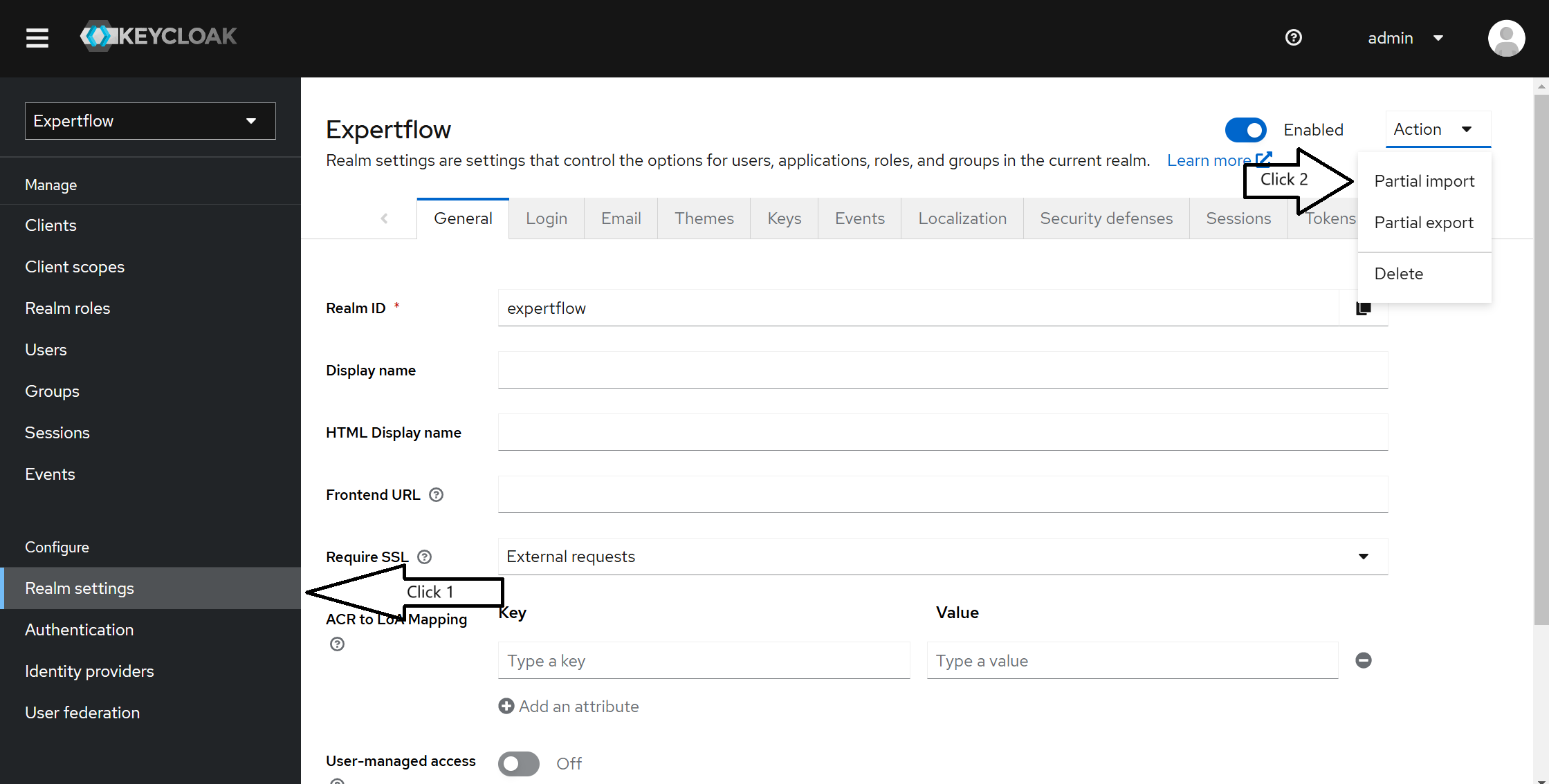 In the ExpertFlow realm, select Realm Settings from the left navigation bar, then click on the Actions on top left. A pop up will open.