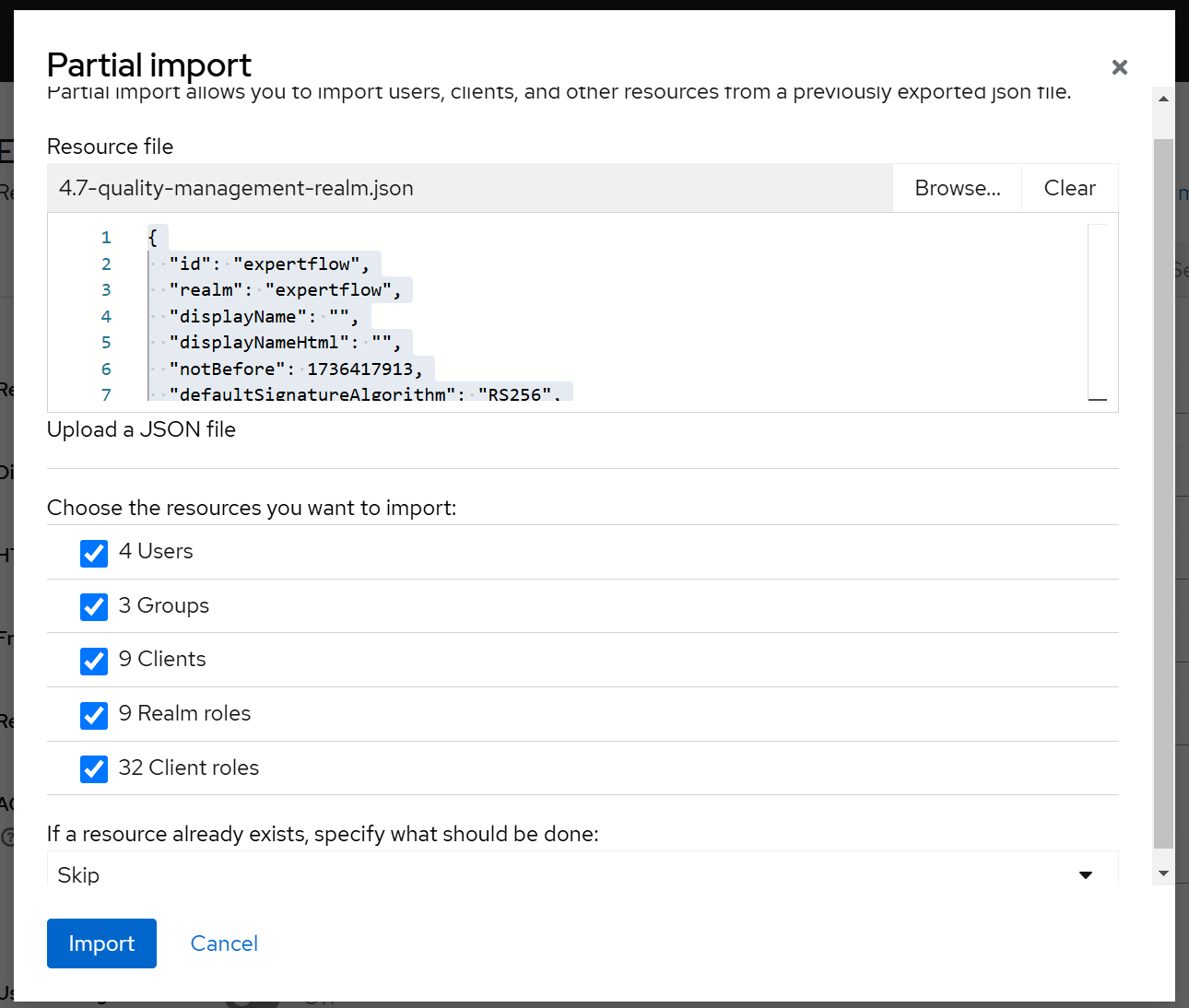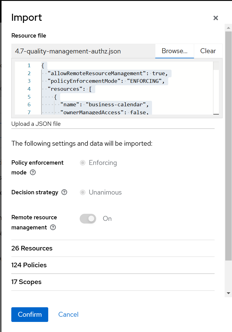 Following are the quality-manager-realm and quality-manager-authz files. First partial import realm to get the relevant Quality Management roles then import the permissions file to get all the quality-management related permissions.