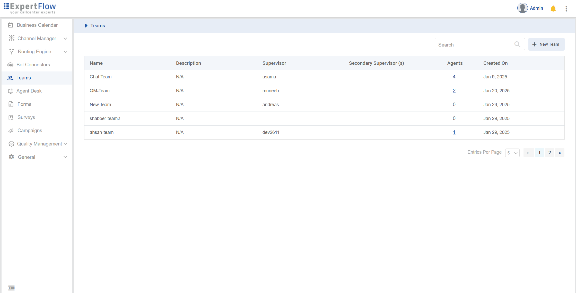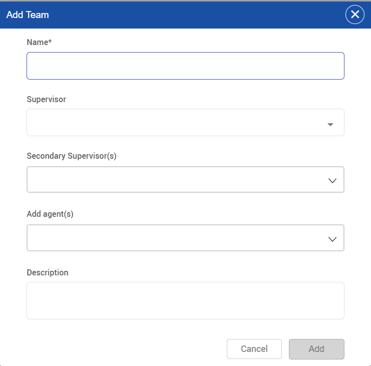 On clicking New Team button, a popup will appear. Fill it accordingly and click on Add. Add team name and add agent from dropdown. Your created user will be available here. Also, only user which have agent role will be available. So make sure you have assigned roles correctly.