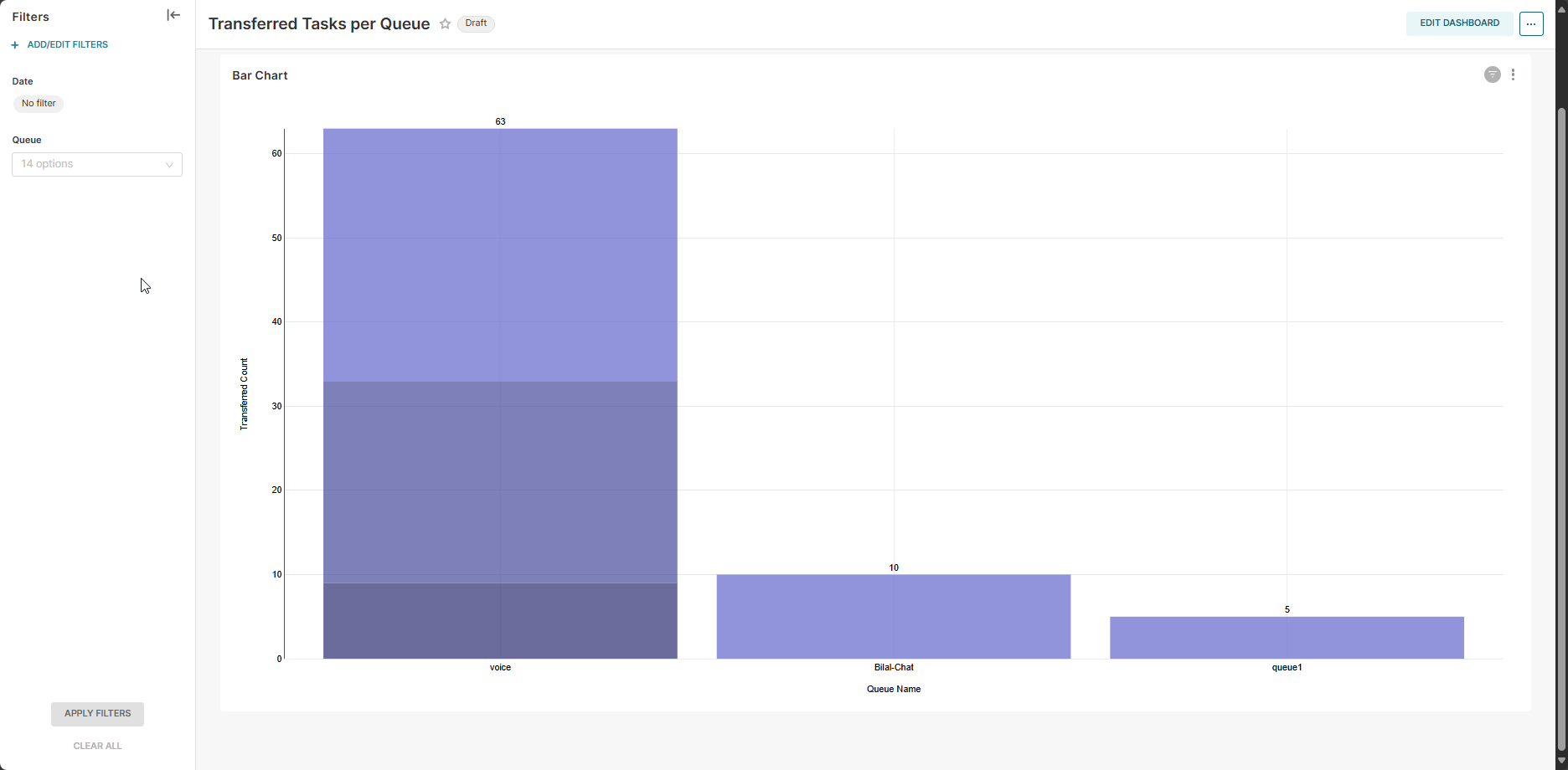 This is not split Date-wise. By default, this bar chart shows all the transferred task data and its count at the top of each bar. Administrators can apply the filters on date and queue as per their requirements.