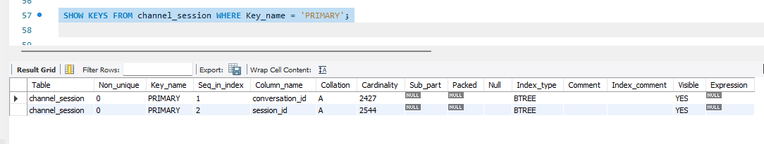 SHOW KEYS FROM channel_session WHERE Key_name = 'PRIMARY';