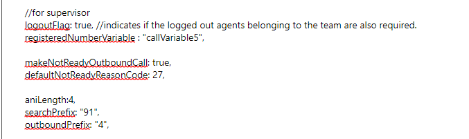 29 defaultNotReadyReasonCode 27 This property is used for changing the agent state to Not ready for the outbound calls if made in Ready state and the makeNotReadyOutboundCall property is set to true. 30 aniLength 7 This is the number of digits from (right to left) that need to be considered for searching records 31 searchPrefix "92" This is the searrch prefix that is appended to the ani, if you don't want any search prefix to be appended then you can set it's value to empty string. 32 outboundPrefix "0" This is the outbound prefix that is appended to the ani, if you don't want any outbound code to be appended then you can set it's value to empty string. 33 callVariablesList {"callVariable1": "Language"} The call variables list is the config where you can decide which variables you want to display on the UI and with what name they should appear on the UI. In the list, you mention the call variable name followed by the value that will appear on the UI. So for example, if you want only call variable 1 to be displayed with the key 'language' then your config should be {"callVariable1": "Language"}. 34 newWindowAutoLogin