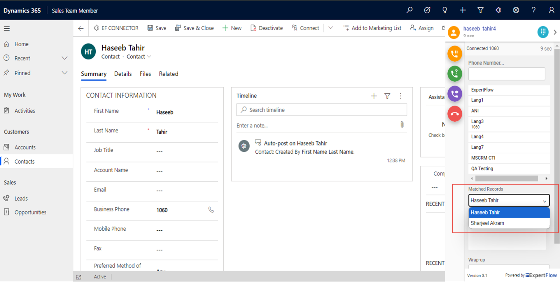 In the case of multiple matches, a list of all the matched records of the respective entity will be shown in the drop-down list in alphabetical order. The first record in the list will automatically pop up, however, the agent can also manually select the customer record from the dropdown list and that customer profile will pop up.