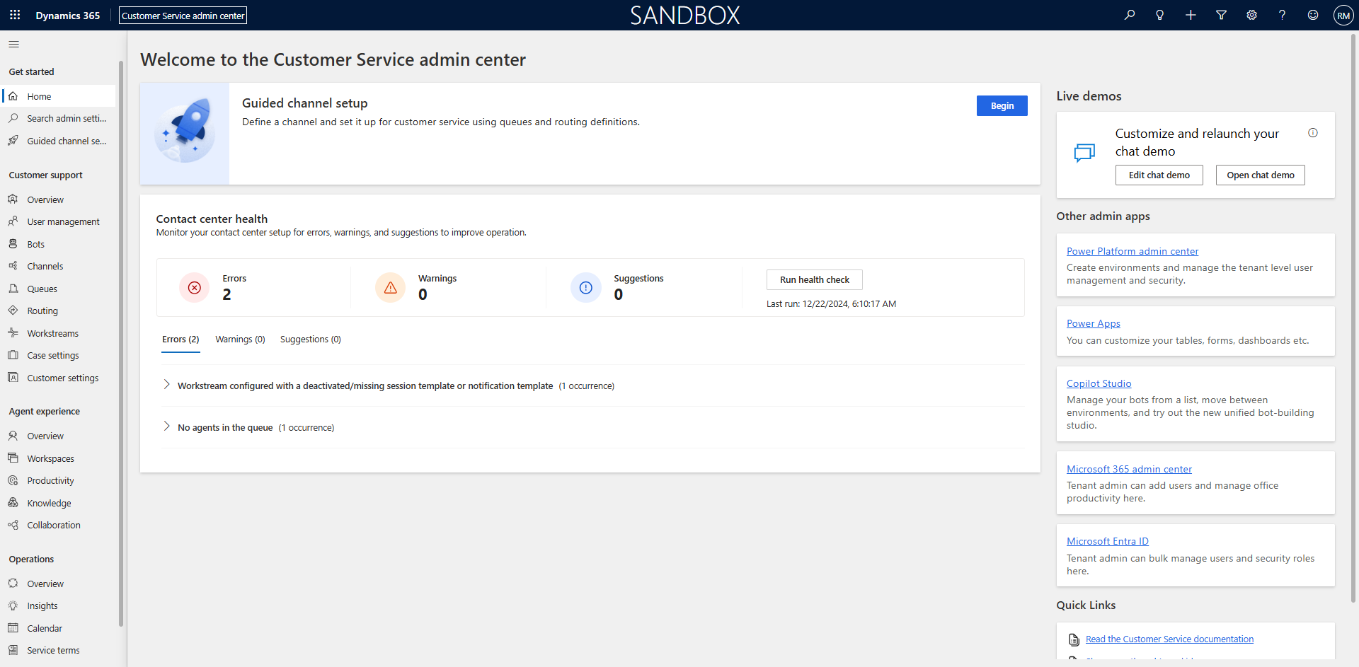 Login to the CRM and go to the 'Customer service admin center' app ’.