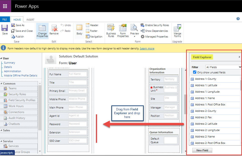 Add the fields in the user information area from the field explorer, click on save to save the form and then publish it.