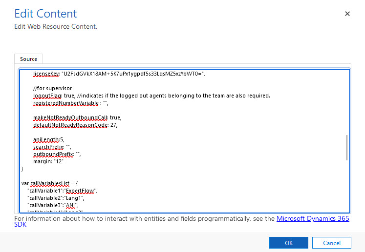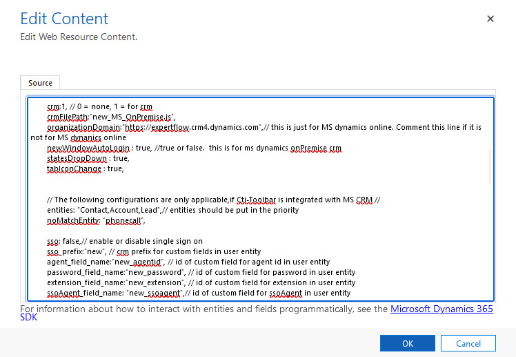 13 | organizationDomain | https://expertflow.dynamics.com | This value can only be set when you are using Microsoft CRM Online (CIF enabled) else you can ignore this property. This is the organization domain of your online CRM | ||||