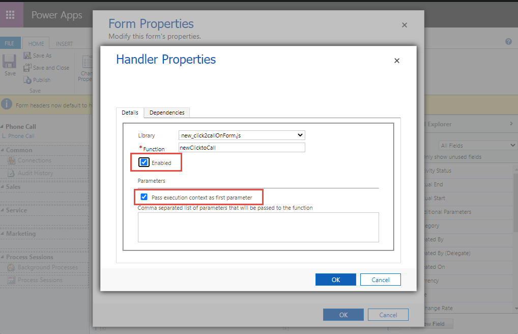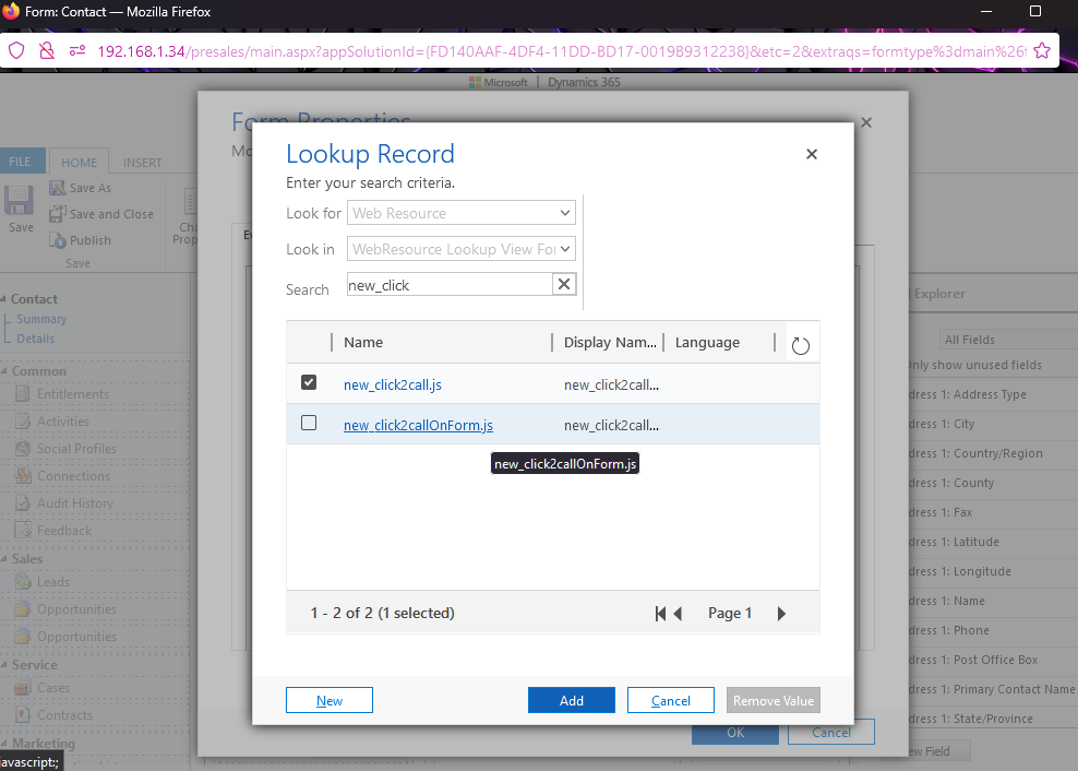 Inside the Form Properties window, Click on add and add new_click2callOnForm.js web resource.