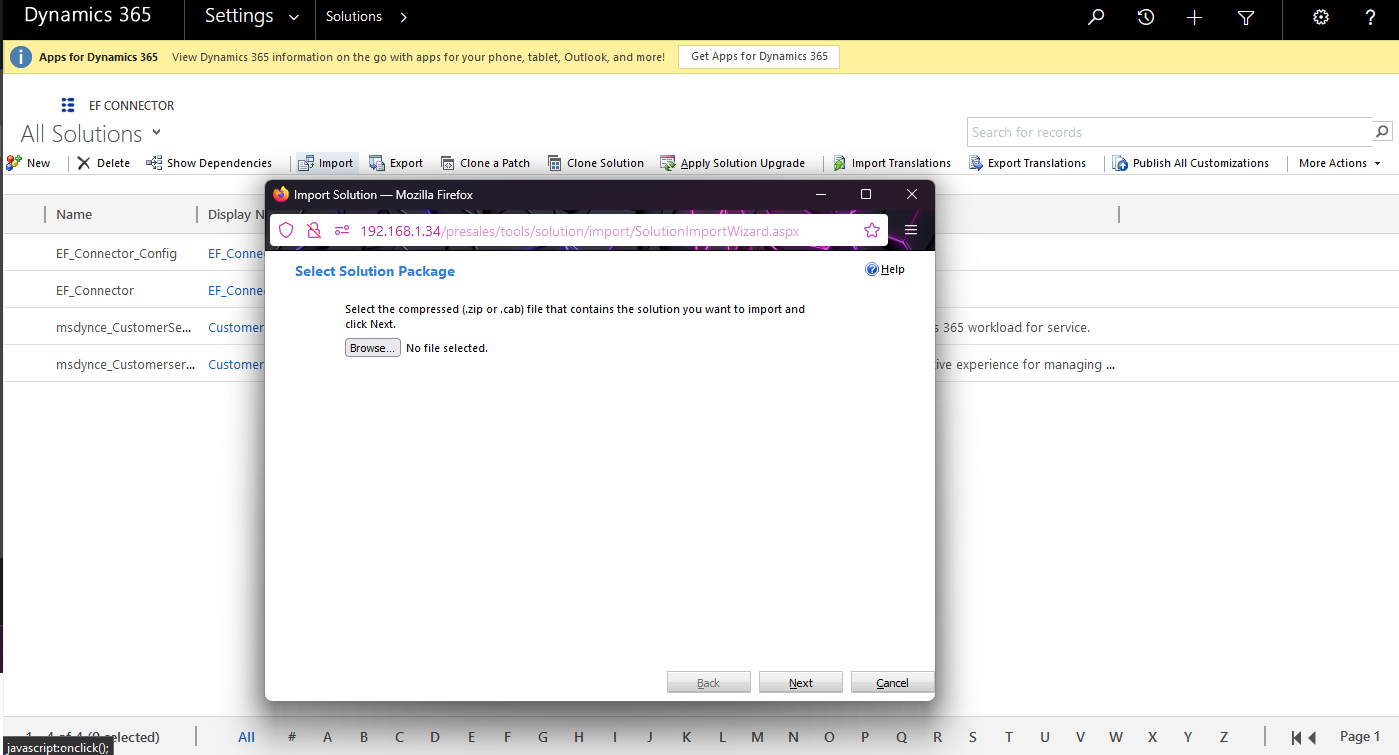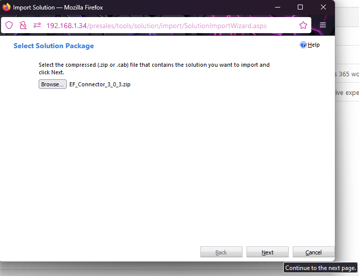 From the import solution window, Select solution package “EFCTI_Managed_3_1_3_1_managed” and click on next