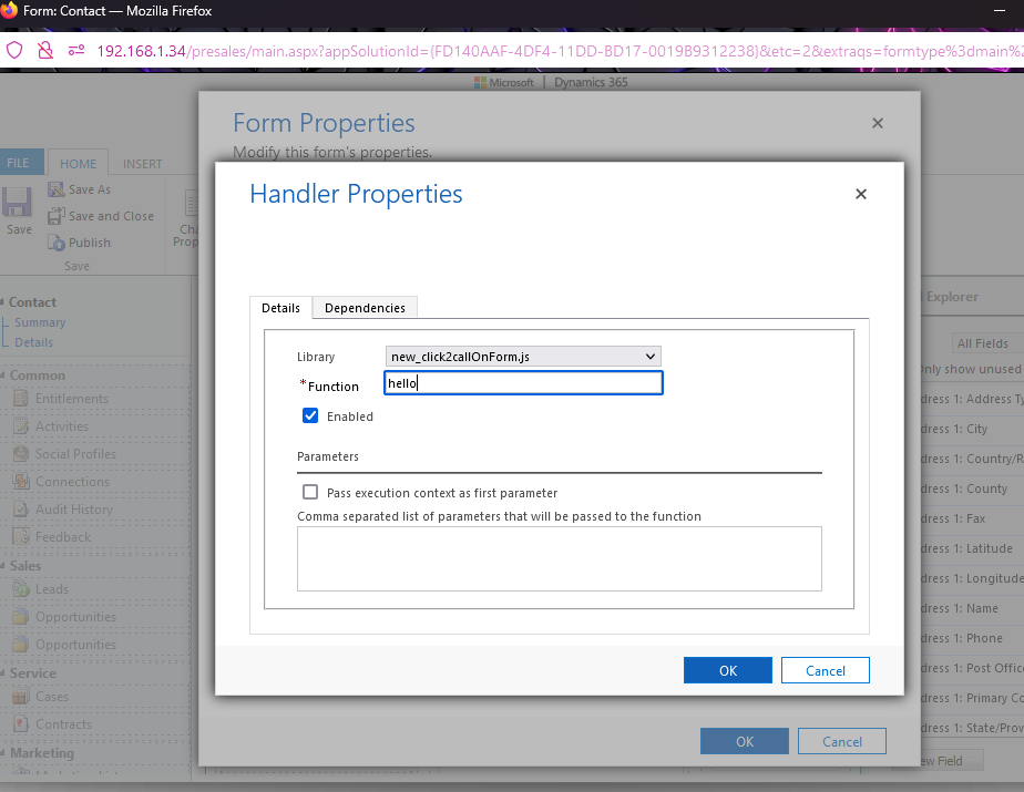 Now inside the Form Properties window, the Event Handlers section add the file new_click2callonForm.js and add the function “hello” OnLoad event of the form