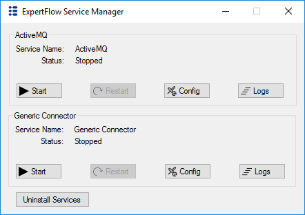 Run EF Service Manager from the Desktop shortcut. The Service Manager shows the status of all of the Connector services. Click on “Install Service” to install both ActiveMQ and Generic Connector services. Once the services are installed, you will be able to configure and use these services.