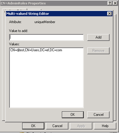 - In the next step, add the user you want to give access to as a unique member of AdminRoles. Here we have added the distinguished name of the user called djtest.