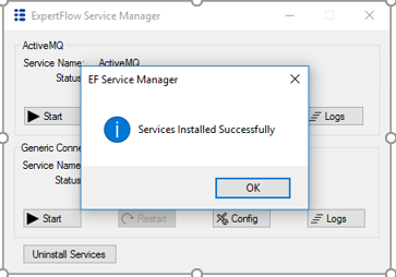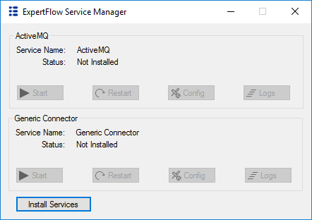 Run EF Service Manager from the Desktop shortcut. The Service Manager shows the status of all of the Connector services. Click on “Install Service” to install both ActiveMQ and Generic Connector services. Once the services are installed, you will be able to configure and use these services.