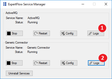 - You can also verify ActiveMQ and GenericConnector from their log files by clicking on Logs button in both Sections.