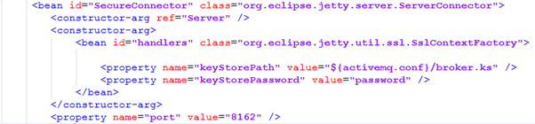 7) Open <EF Connector Home>\conf\jetty.xml . In the property, name keystorePath change the value to be the name of your Keystore file. Also, change the property name Keystore passwords value to be the password of the Keystore. As shown here we can encrypt the password.