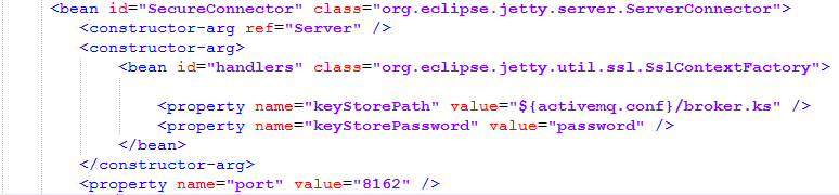 7) Open <EF Connector Home>\conf\jetty.xml . In the property name keystorePath change the value to be the name of your keystore file. Also change the property name keystorePassword’s value to be the password of the keystore. As shown here we can encrypt the password.