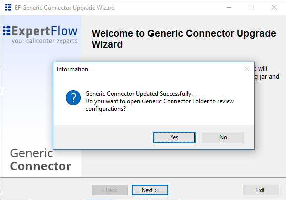 - Click OK. It will upgrade the existing GC with old configurations. It will ask you to review the configuration file. You need to ensure that all the newly introduced parameters are available in GC Config. Click Yes to open the installation folder. See Generic Connector Configuration.