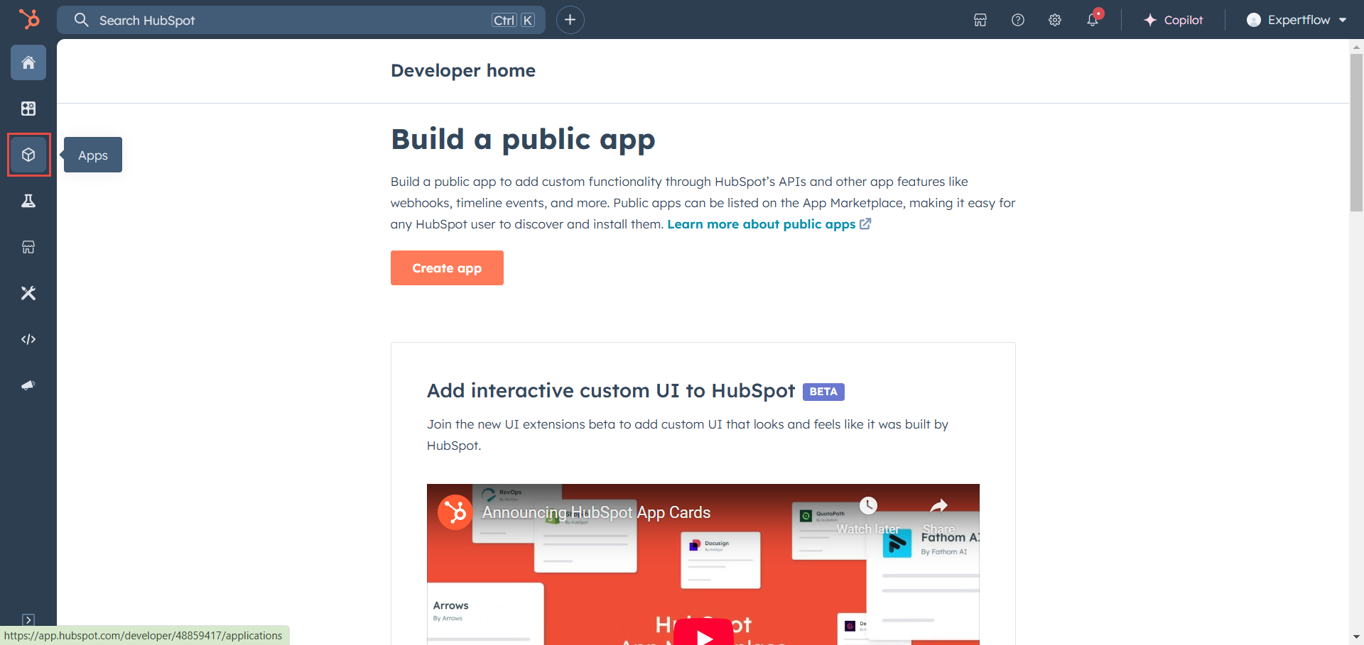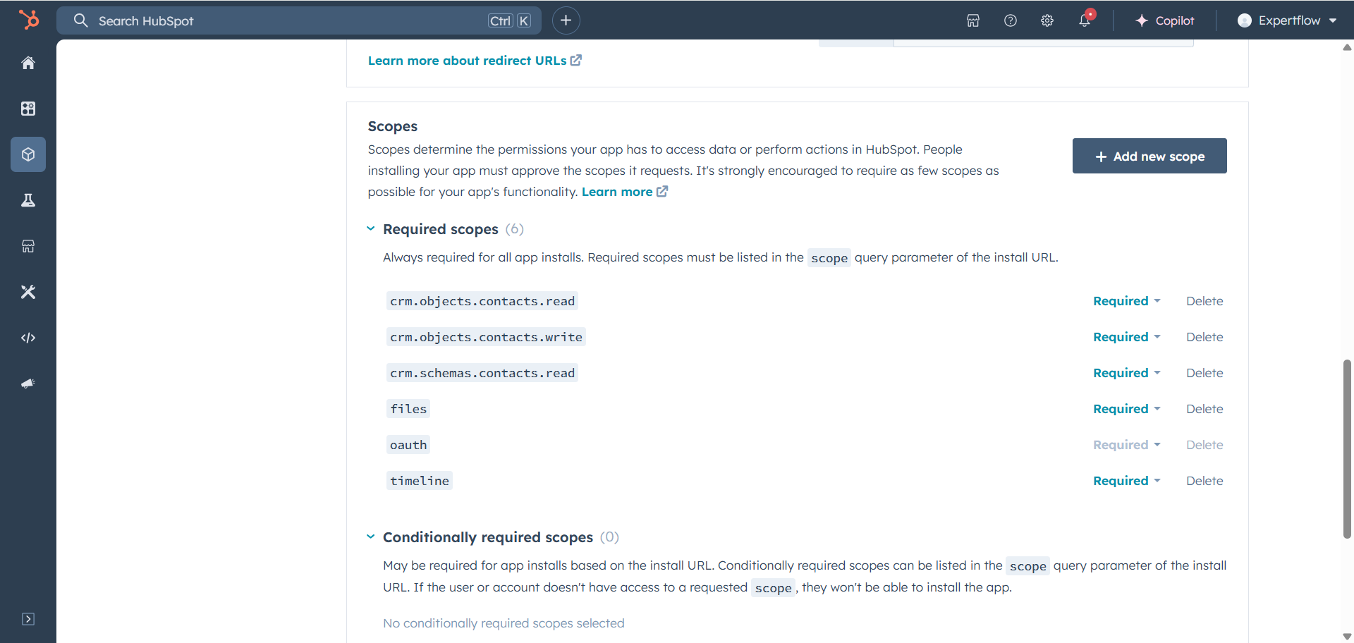 https://<FQDN>/<path>/oauth-callback, where<FQDN>is the domain/hostname where our app is deployed (e.g.projectsdemo.expertflow.com)<path>is the path to the connector as defined in the Ingress file (default:/hubspot-connector)/oauth-callbackis our static authentication redirect route.Make sure to add