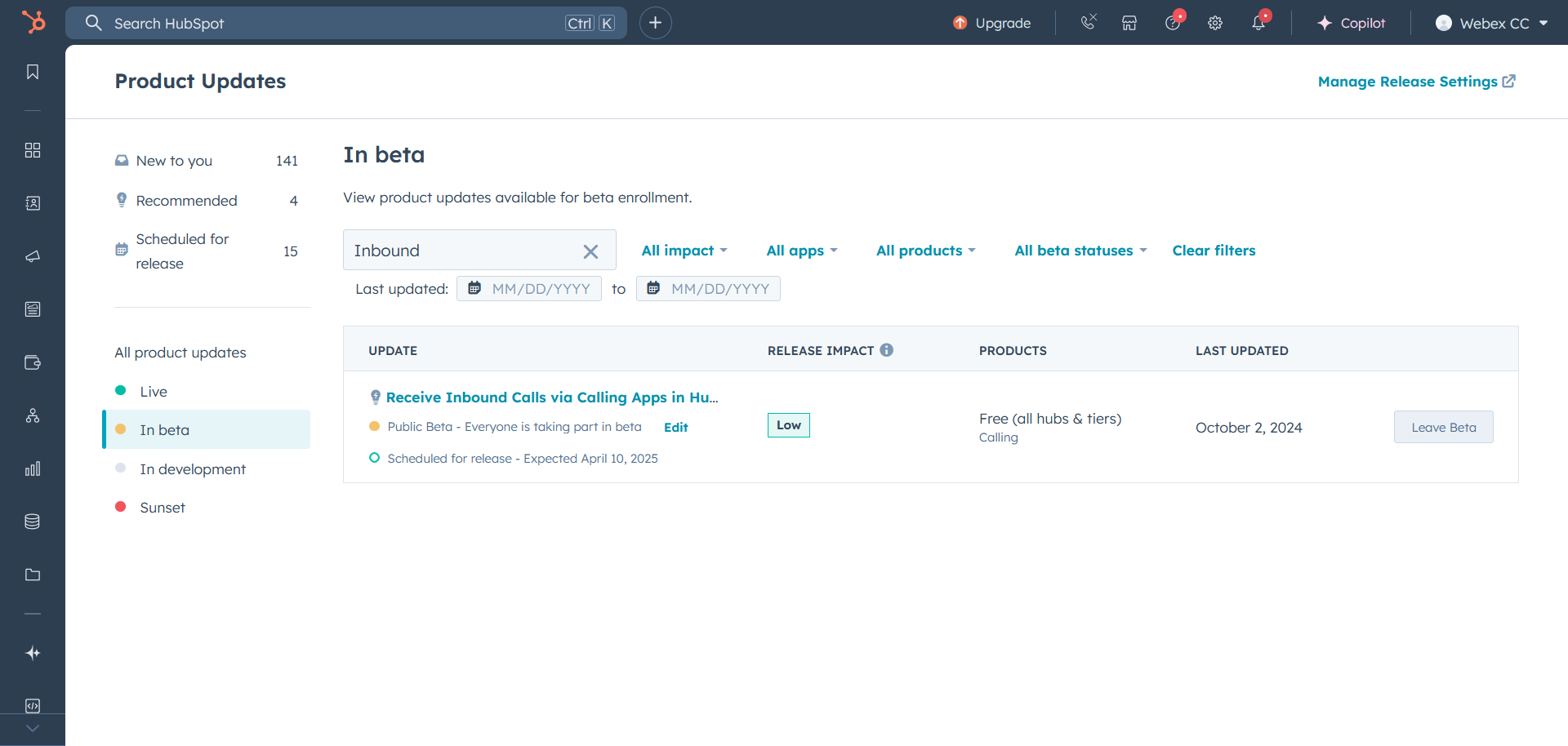 Search for “Inbound”, and join the Receive Inbound Calls via Calling Apps in Hubspot Beta for all users on your account.