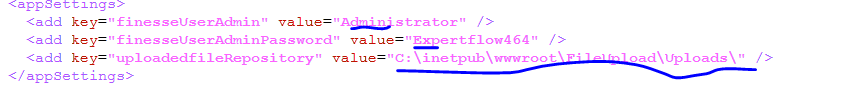 - Update following higlighted fields for; Datasource, FileUPload API (provide the link to Uploads folder), finesse credentials.