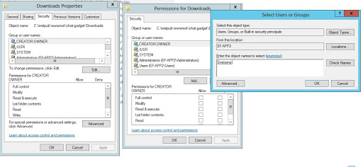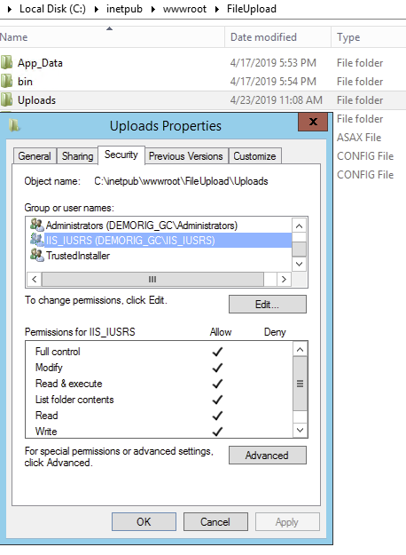 Extract the zip (downloaded under “Deployment” section above) and create a folder on C:\inetpub\wwwroot by name, Fileupload and copy the extracted content into it. Add another folder within this folder and give it a name “Uploads” and grant read/write access to local admin user and IIS as shown below