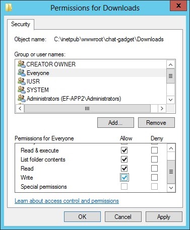 6. Now in Permissions for Downloads window select the checkbox in front of Write as shown in the following figure