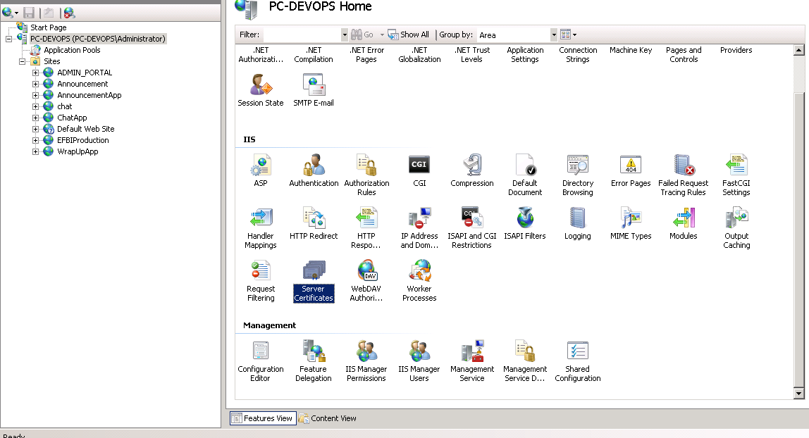 - Click on the PC Name, double click on the server certificates from the IIS portion, as shown in the figure below