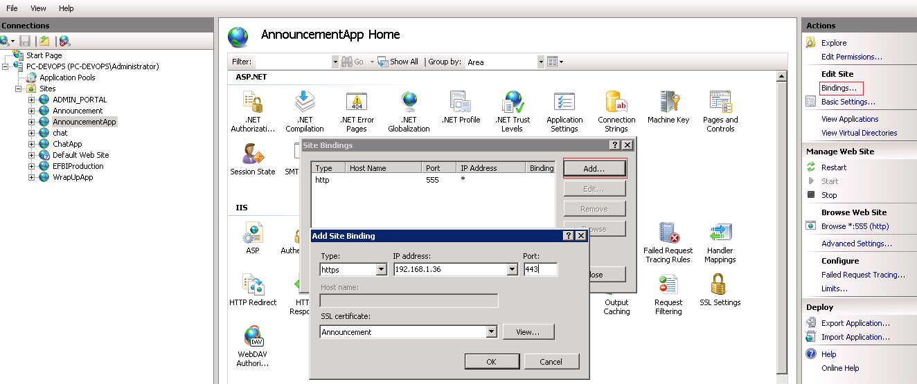 4. Go back to Chat App site, and add another http binding. This new http port will be used by below highlighted API. *Please note*, you can only do this, if you baseURL & dbBaseURL APIs are running on https