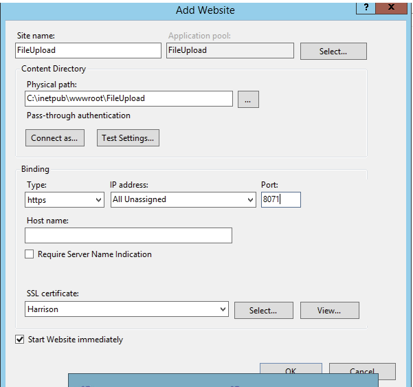 - Physical path (C:\inetpub\wwwroot\FileUpload)