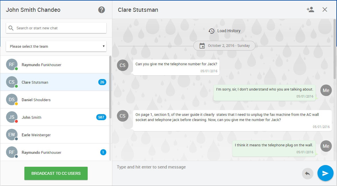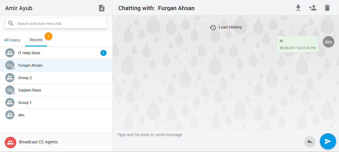 Chat history for an agent to agent chat and broadcast chat is maintained in the gadget. By default, only 10 messages are loaded in the gadget or equal to. An agent can scroll to the top where he can find the “load History” button to load 10 more previous messages.