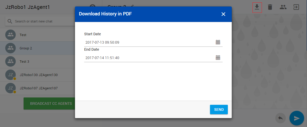 Agents can download group, agent-to-agent, and broadcast chat history as a pdf file. History is downloaded between two dates and times.