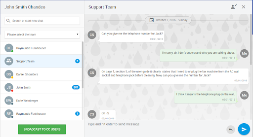 Agents can have one to one conversations with each other. An alert is shown against the agent's name when a new message arrives. Date/Time for every message is shown along with the message text.