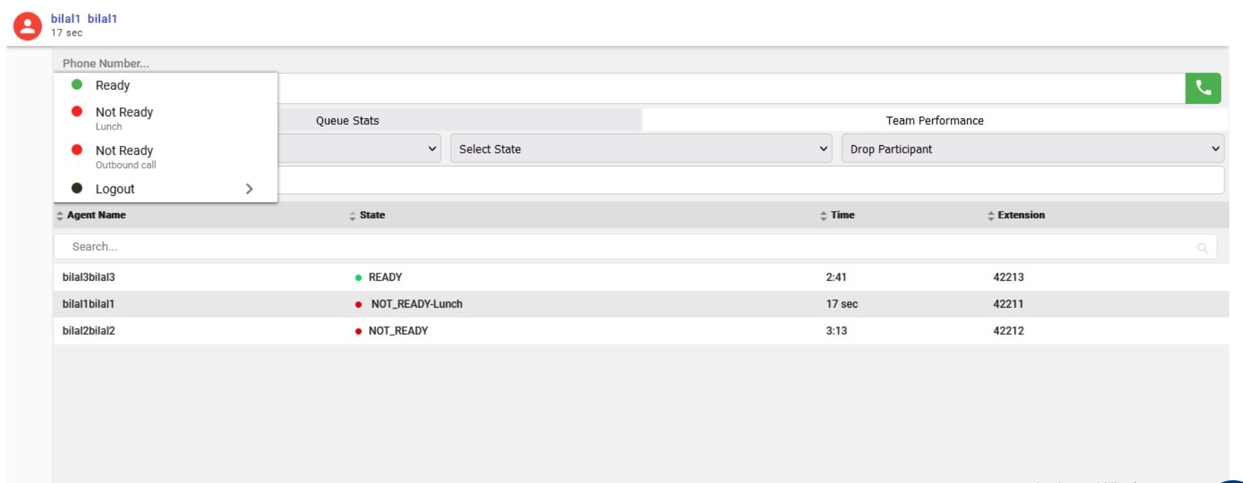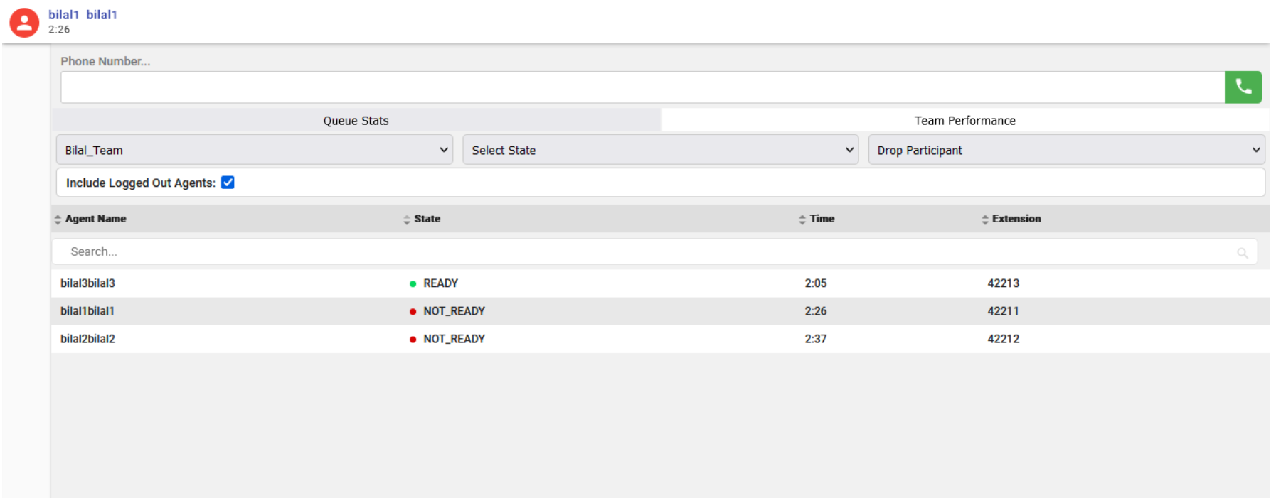 A list of agents for the selected team, their current state, time in the state, and extension appears. You can click the headers of the columns to sort by Agent Name, State, Time in State, or Extension. You can also search the agent via search box.