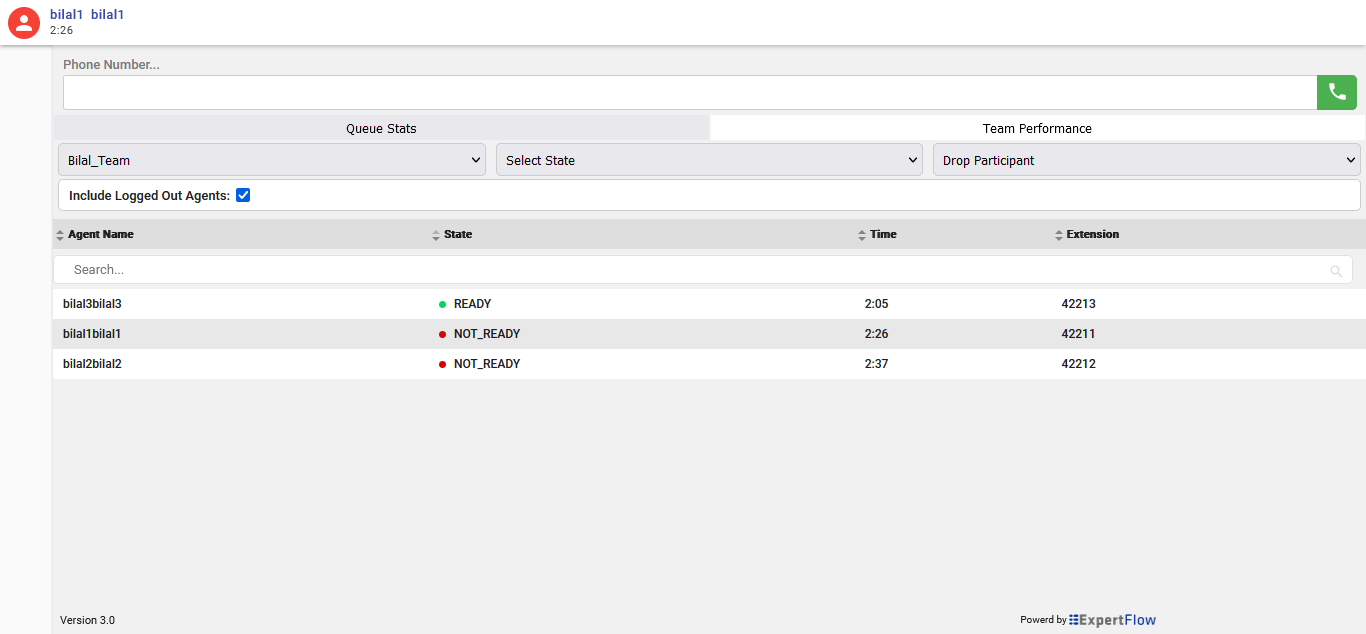 A list of agents for the selected team, their current state, time in the state, and extension appears. You can click the headers of the columns to sort by Agent Name, State, Time in State, or Extension.  You can also search the agent via search box.