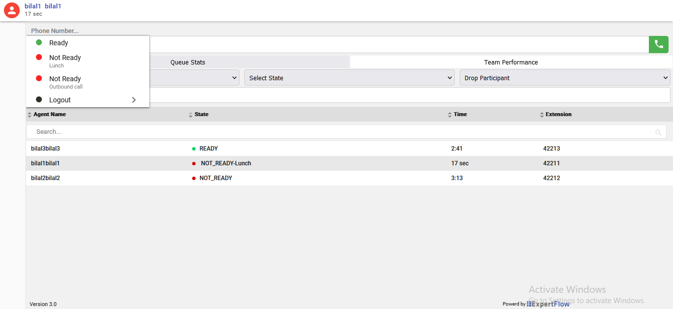 In the select state dropdown, the Ready or Not Ready and Sign Out options are active only if the action is allowed. For example, if you select an agent who is in the Ready state, you will see only the Not Ready and Sign Out options will be active, and the Ready Option will be greyed out. If you select an agent who is in the Not Ready state, you will see only the Ready and Sign Out options active, the Not Ready option would be greyed out.