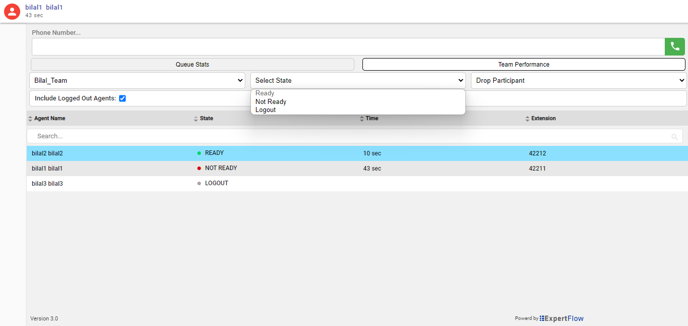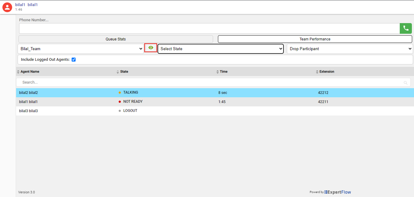 A list of agents for the selected team, their current state, time in the state, and extension appears. You can click the headers of the columns to sort by Agent Name, State, Time in State, or Extension. You can also search the agent via search box.