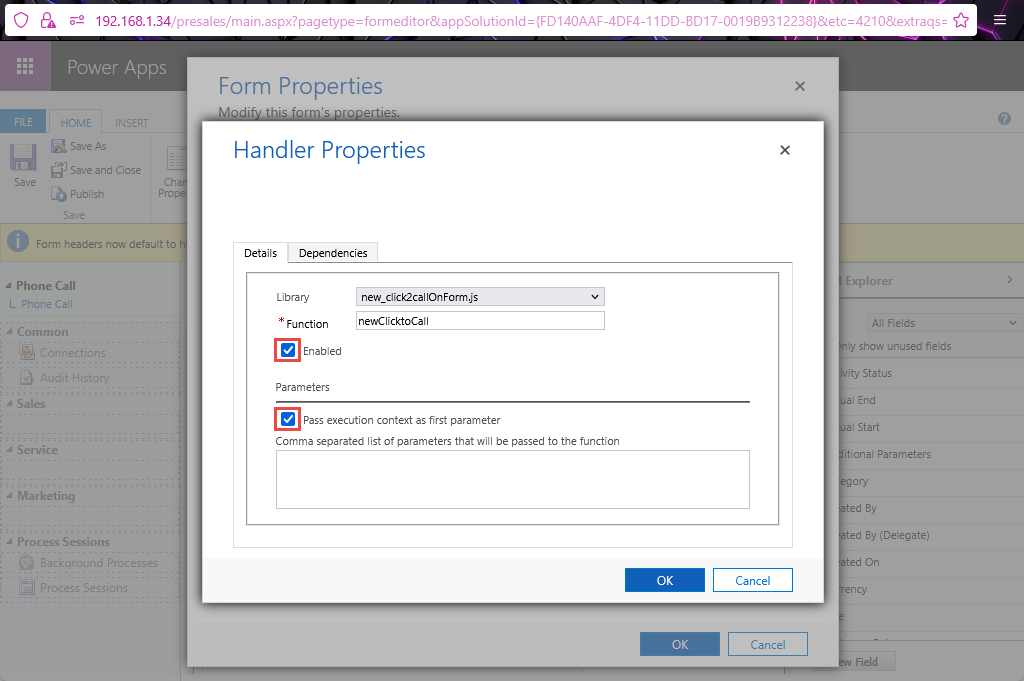 Inside the Form Properties window, Click on add and add new_click2callOnForm.js web resource.