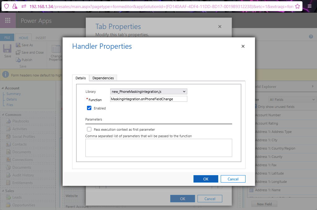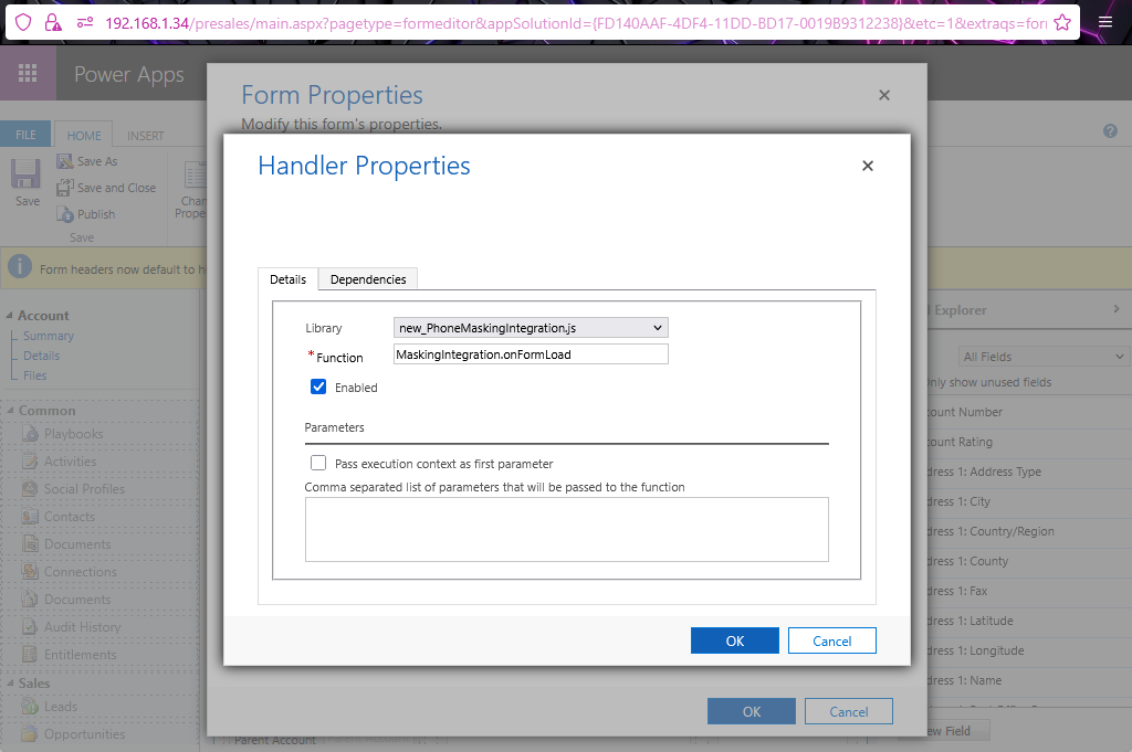 Now inside the Form Properties window, the Event Handlers section add the file new_PhoneMaskingIntegration.js and add the function “MaskingIntegration.onFormLoad” OnLoad event of the form.