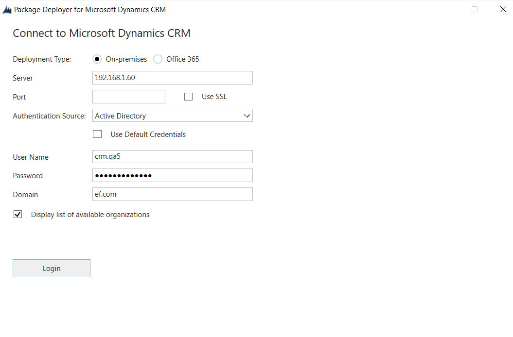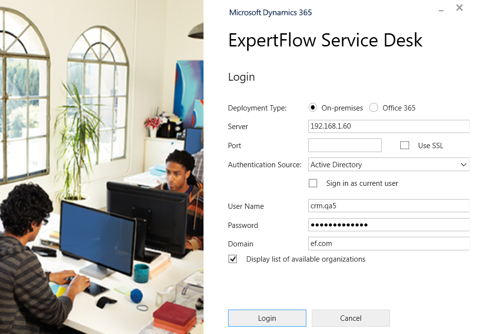 - Enter Unified Service Desk login credentials of the relevant CRM user (working as a Cisco contact center agent), mark the check box for display list of available organizations and click on Login.