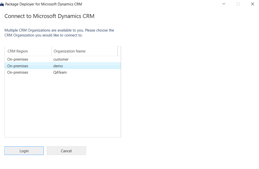 - Select the Organization where you want the CTI configurations to be applied. If you don’t select one, the package will be installed in the user’s default organization. After selecting the required organization click on login button or click on cancel the procedure.