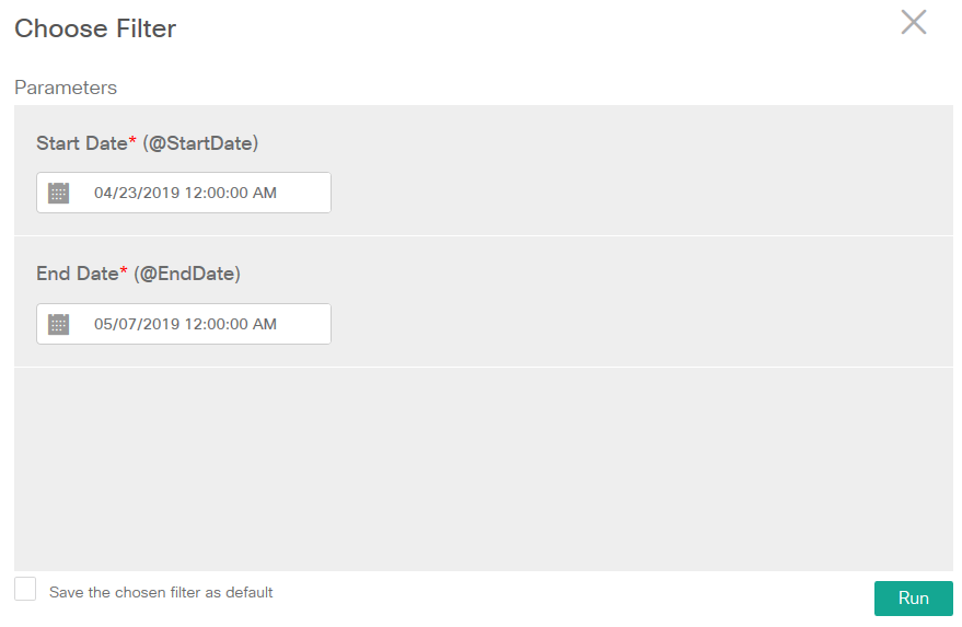 Select Start Date, End Date, and Survey Name. Select a maximum of one survey at a time from the filters.
