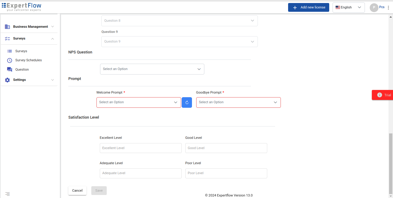 NPS | For a survey that has to generate an NPS report, it has to include a question of type NPS in the survey. While creating an NPS question, set this flag to “Yes”. An NPS question always has a rating scale of 1-10 no matter what rating scale has been configured on the backend. So the rating scale selected in the application configuration (i.e., 1-5 OR 0-9) is applicable to all non-NPS questions across all PCS surveys. Check with your system administrator to know what rating scale is being configured in the application. |