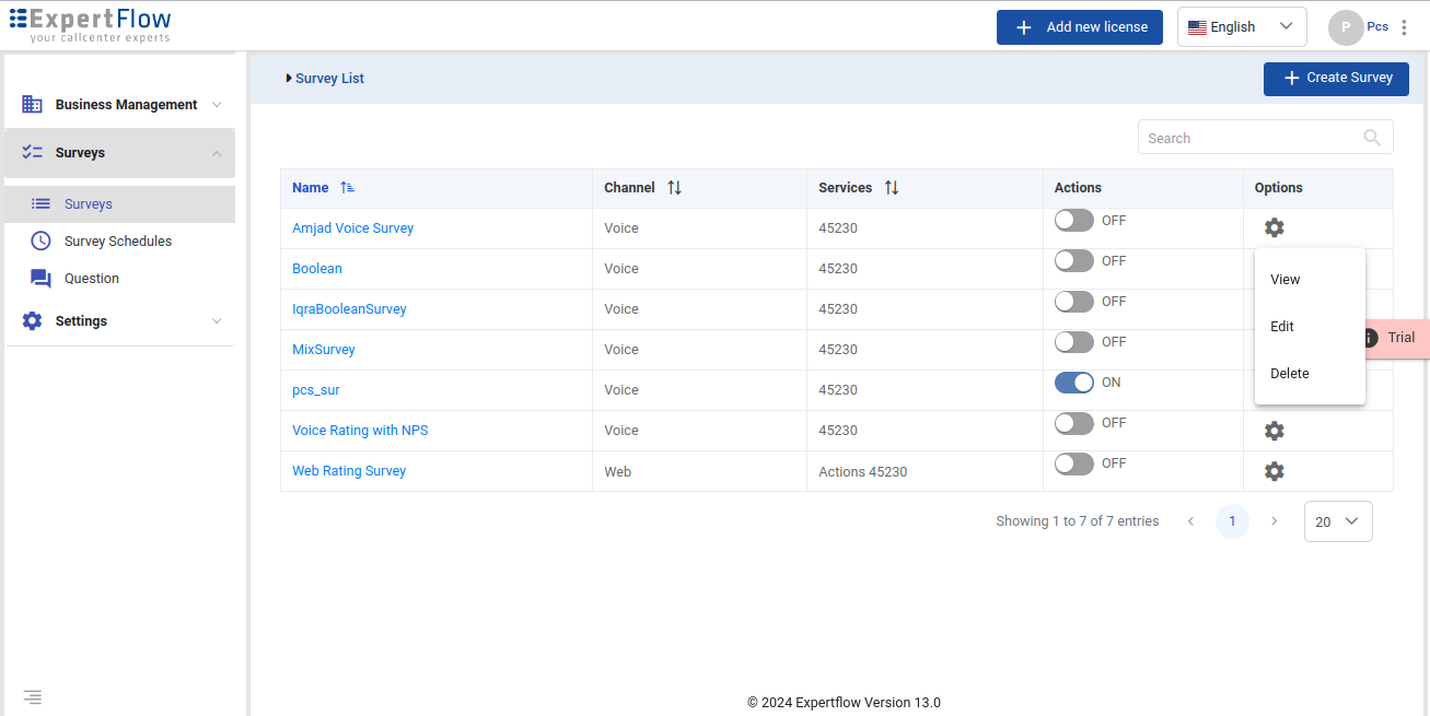 The other options against an existing survey include Edit, Delete, and View the survey.