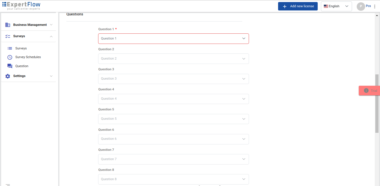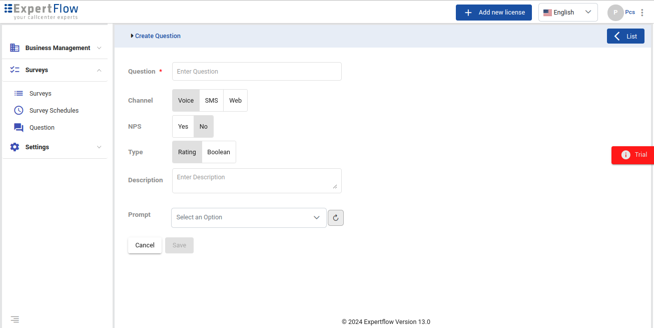 The Questions management feature allows you to create and manage your survey questions. The questions are the audio files in case of IVR survey, SMS text in case of SMS surveys, and textual questions with several rating or two boolean options in the case of web surveys.