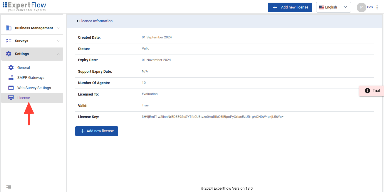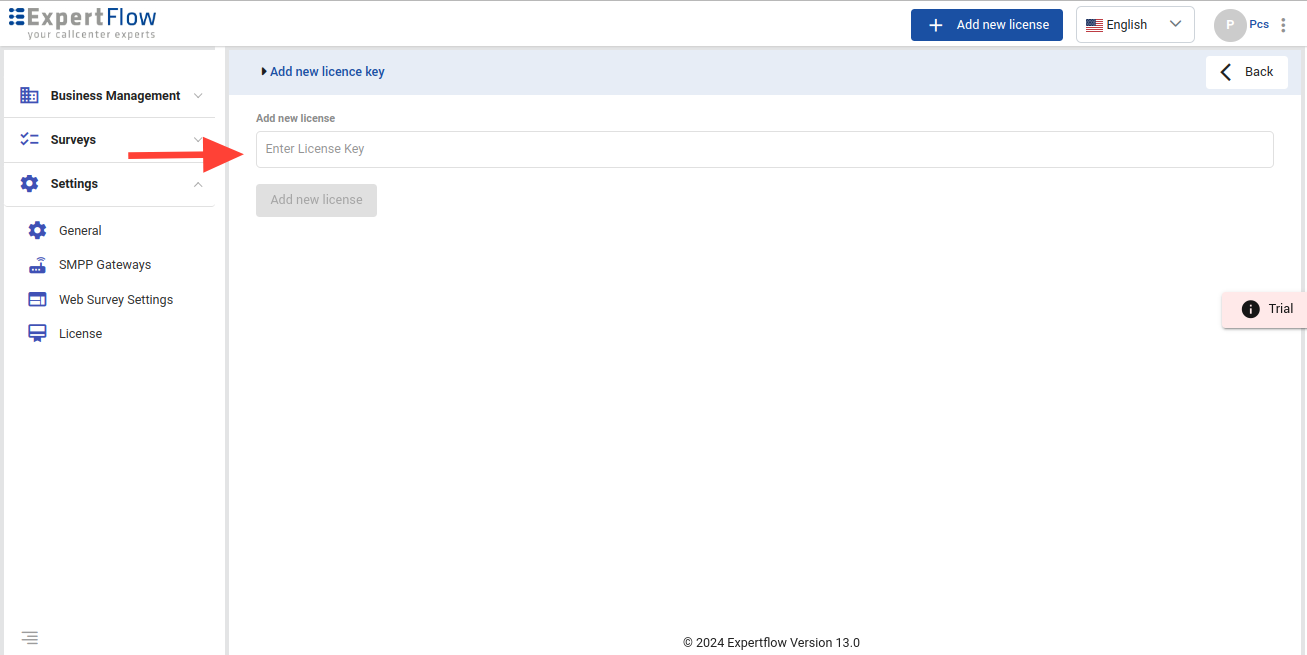 The License Key can be added from the same Setting - > License page. And also after logging in, the Add new licence appears, and from there you can just add the license Key.