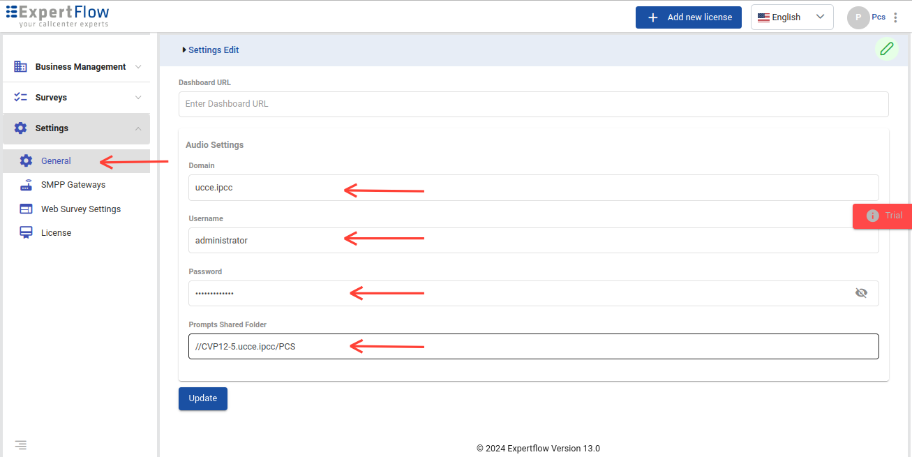 Settings are specified to define the location from where to synchronize the audio prompt files which are used in PCS IVR surveys. This setting should be configured only in the case of UCCE-based deployment.